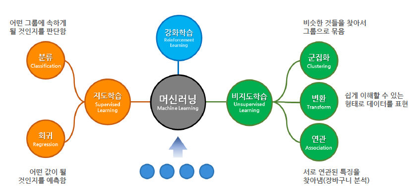 - 클러스터링(Clustering) : 주어진 데이터를 학습하여 적절한 분류 규칙을 찾아 데이터를 분류함을 목적으로 함. 정답이 없으니 성능을 평가 하기 어려움(비지도 학습)