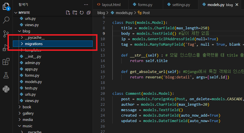 migrations : 현재 app의 models.py에 구현된 모델들에 대한 변경작업을 기록하는 파일들이 저장되는 디렉토리