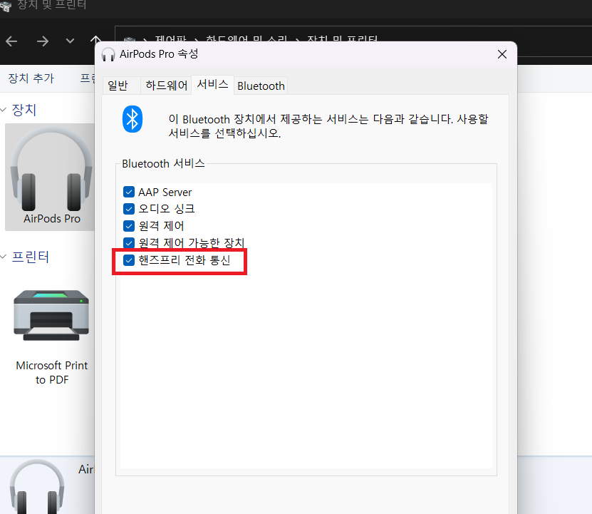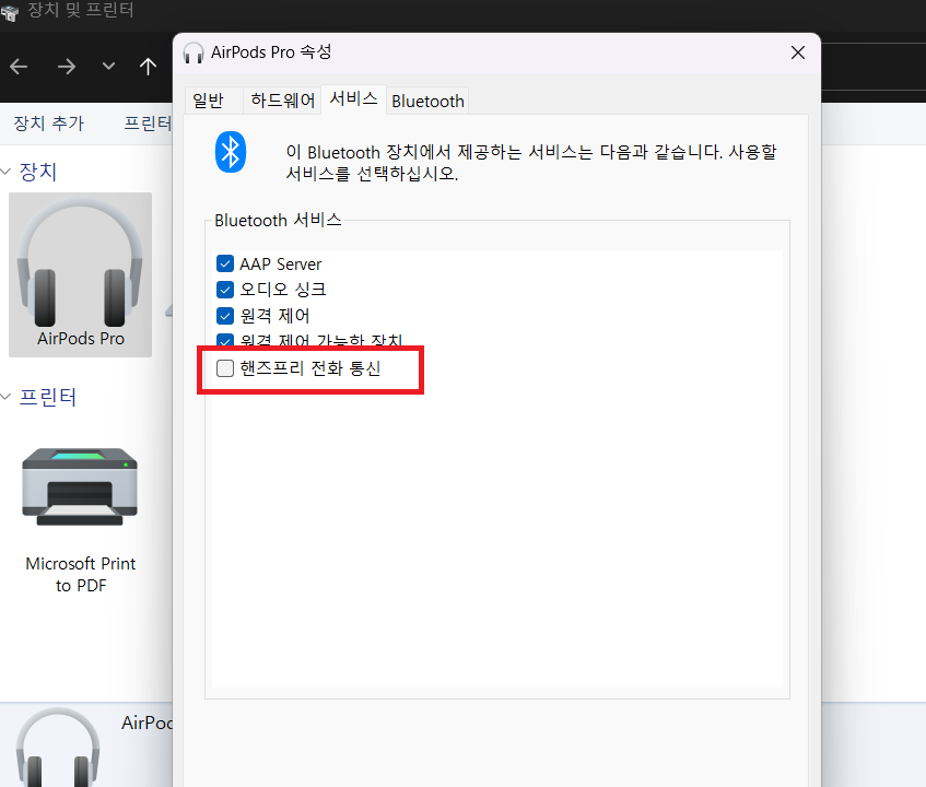 장치들과 프린터들이 보일텐데 본인의 에어팟을 선택해서 '서비스' 탭에있는 '핸즈프리 전화 통신'을 꺼주자