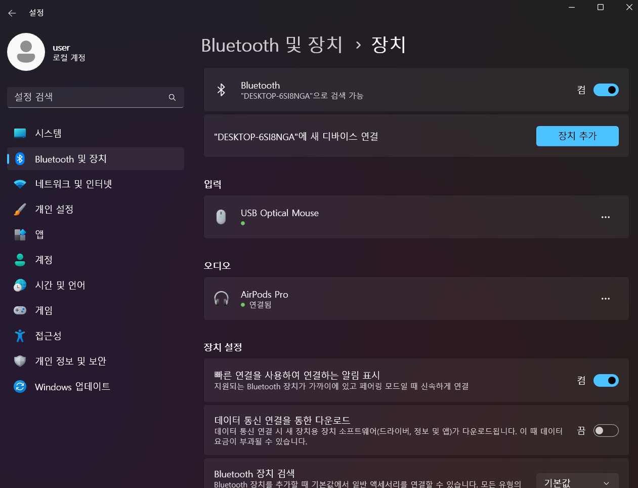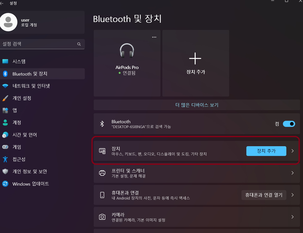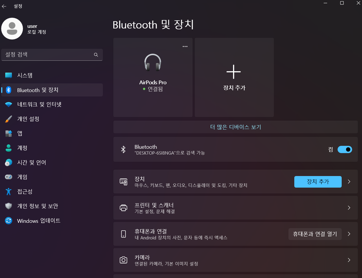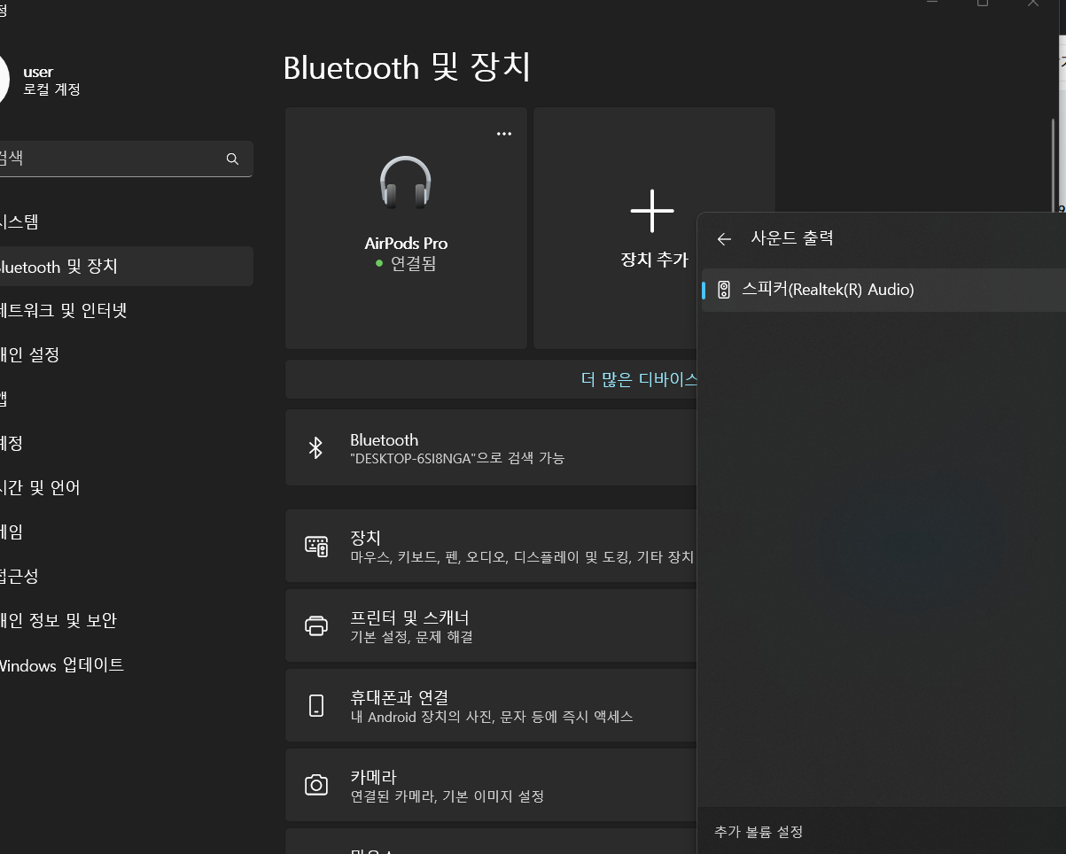 블루투스 설정에 들어가도 저렇게 떡하니 에어팟 프로 연결됨이 떠 있다.