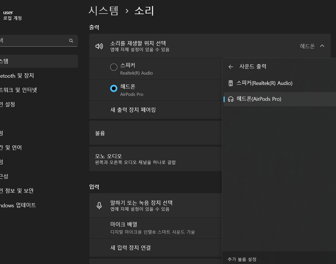 사운드 출력에 에어팟이 보인다.