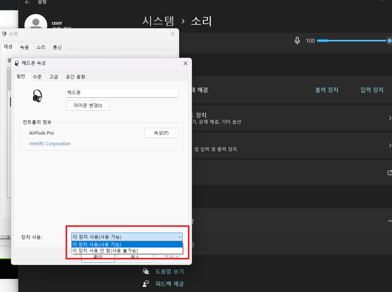 에어팟 설정에 들어가서 '이 장치 사용(사용 가능)'으로 설정.